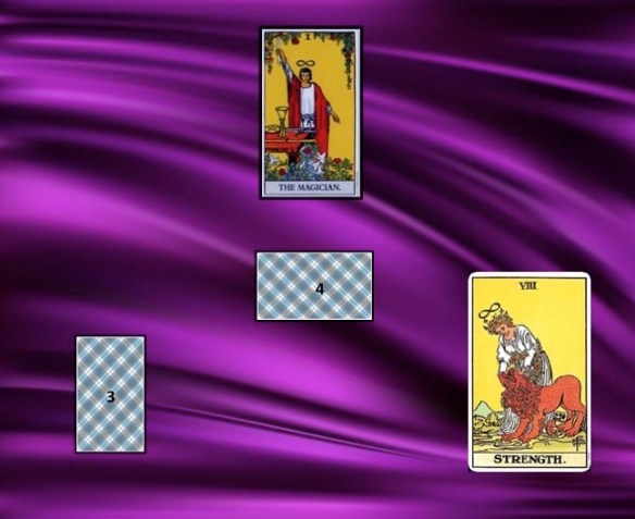 Take a moment to shuffle the 4 cards, holding the intention of opening to your inner strength and courage. Breathe your energy into them and envision that what you need will be shown to you. After shuffling place the cards face down in the pattern below.
